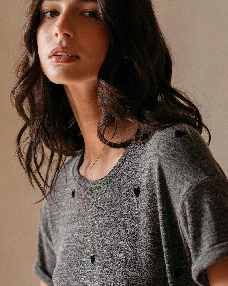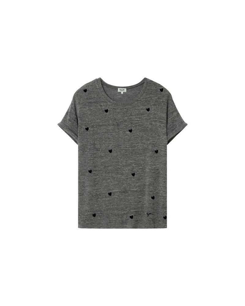 La coupe : DONJUAN est un tee-shirt col rond, manches courtes, avec une impression de petits cœurs en velours sur le buste.