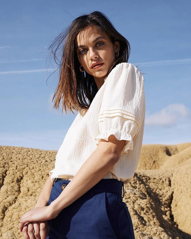 La silhouette : Cette blouse ravissante est une des pièces iconiques de la collection. Avec ses manches ballons esprit bohème et le détail des volants sur l’encolure, CARLSON fait chavirer les cœurs. On craque pour son tissu en coton gaufré hyper agréable sur la peau et son allure ultra mode !