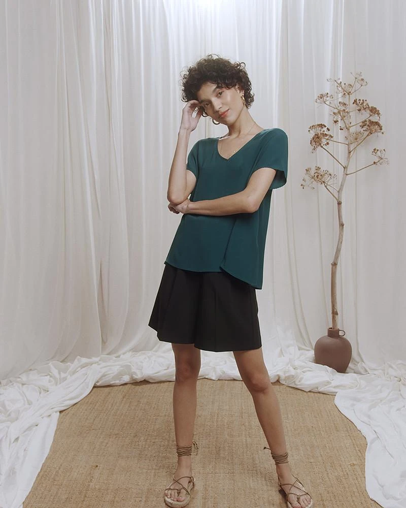 La coupe : CASEY est un top à manches courtes avec un décolleté en V festonné et une ouverture boutonnée au dos.