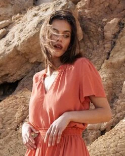 La coupe : CASPIAN est un top à manches courtes tulipes avec un décolleté en V et un petit col mao de fronces.