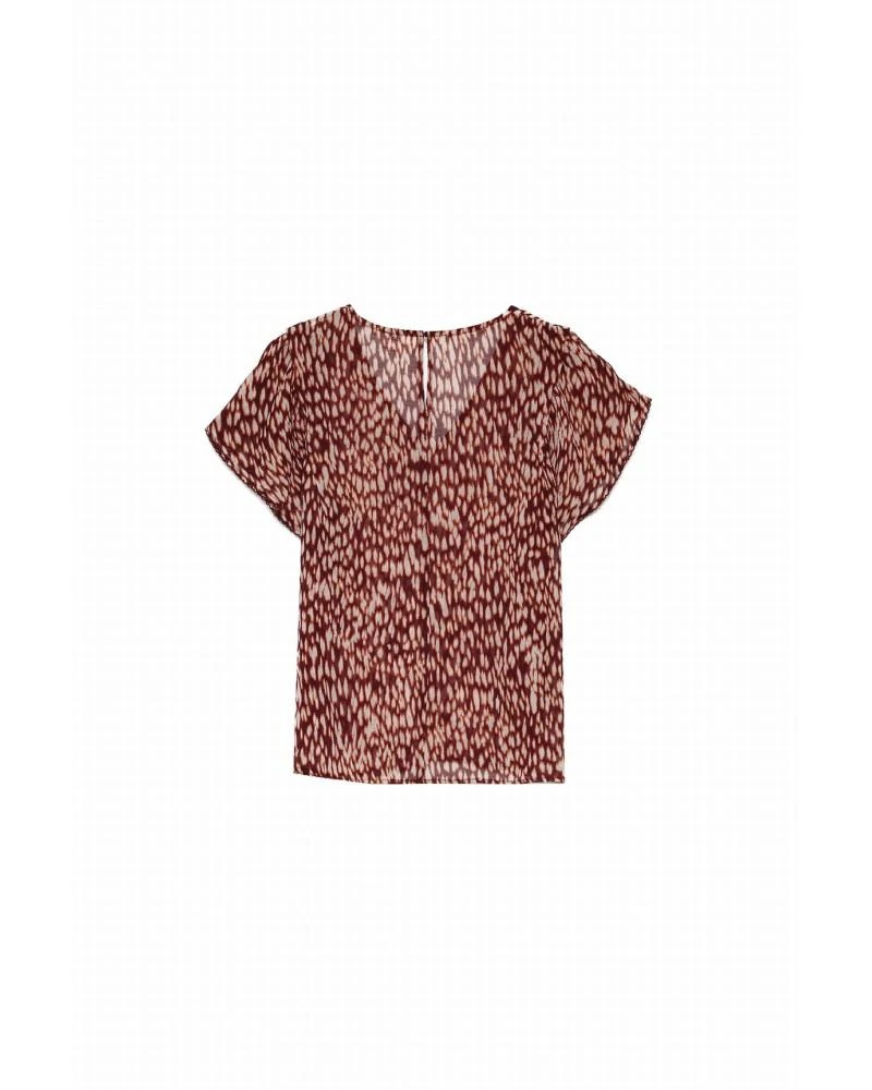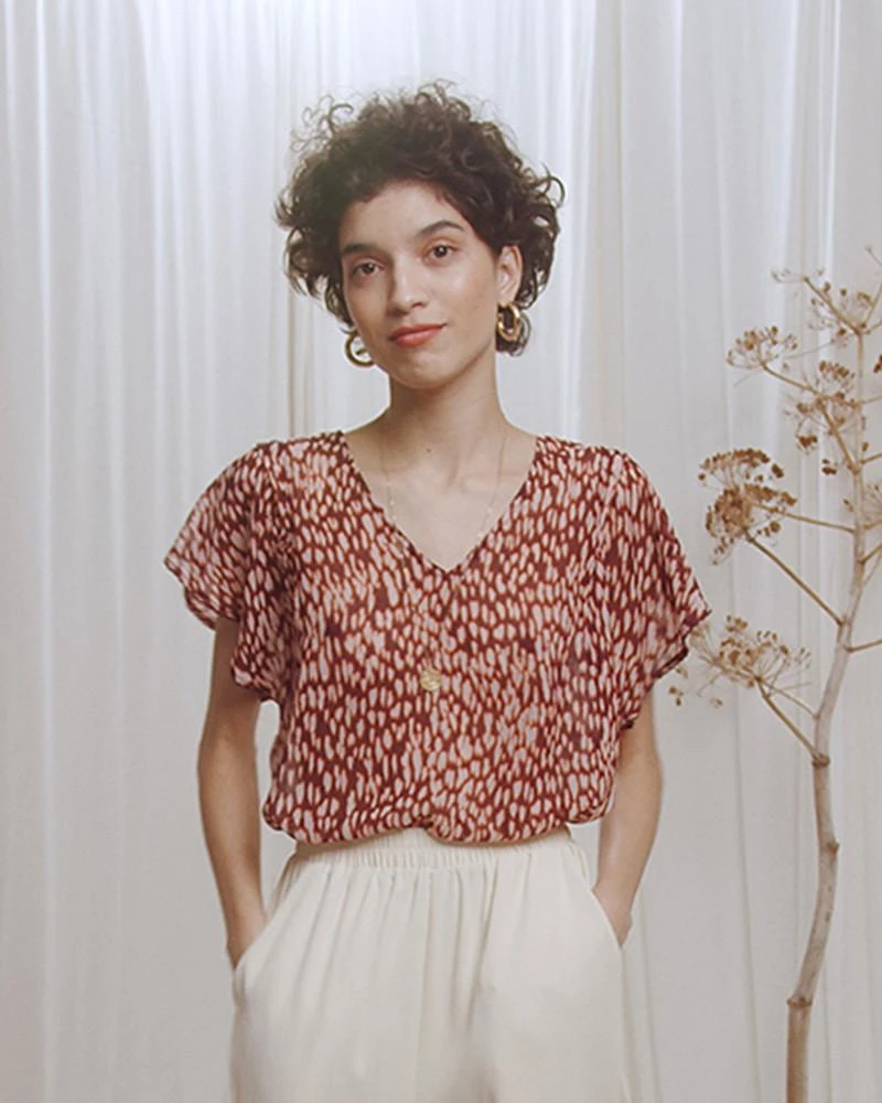 La coupe : CAVIAR est une blouse en mousseline imprimée à manches courtes évasées avec un décolleté en V.