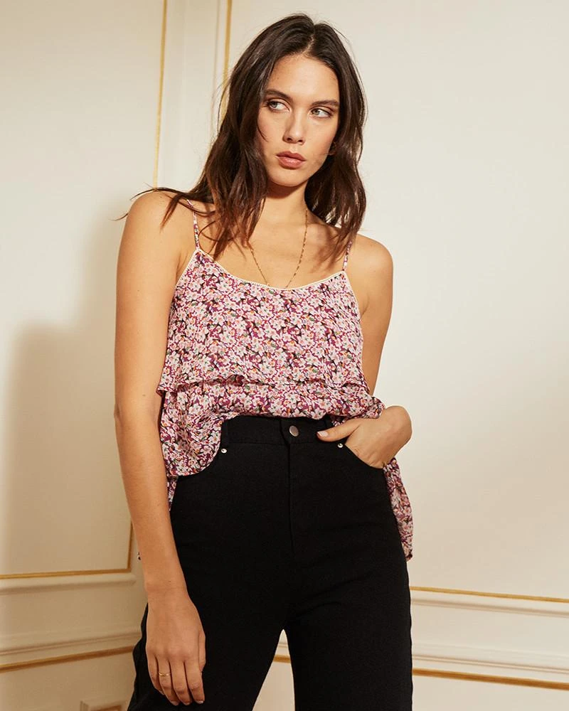 La silhouette : Un débardeur volanté et fleuri, pour une silhouette bucolique et gourmande. CLERY est frais, CLERY est ravissant. Son tissu léger et voilé est également doublé et hyper agréable sur la peau.