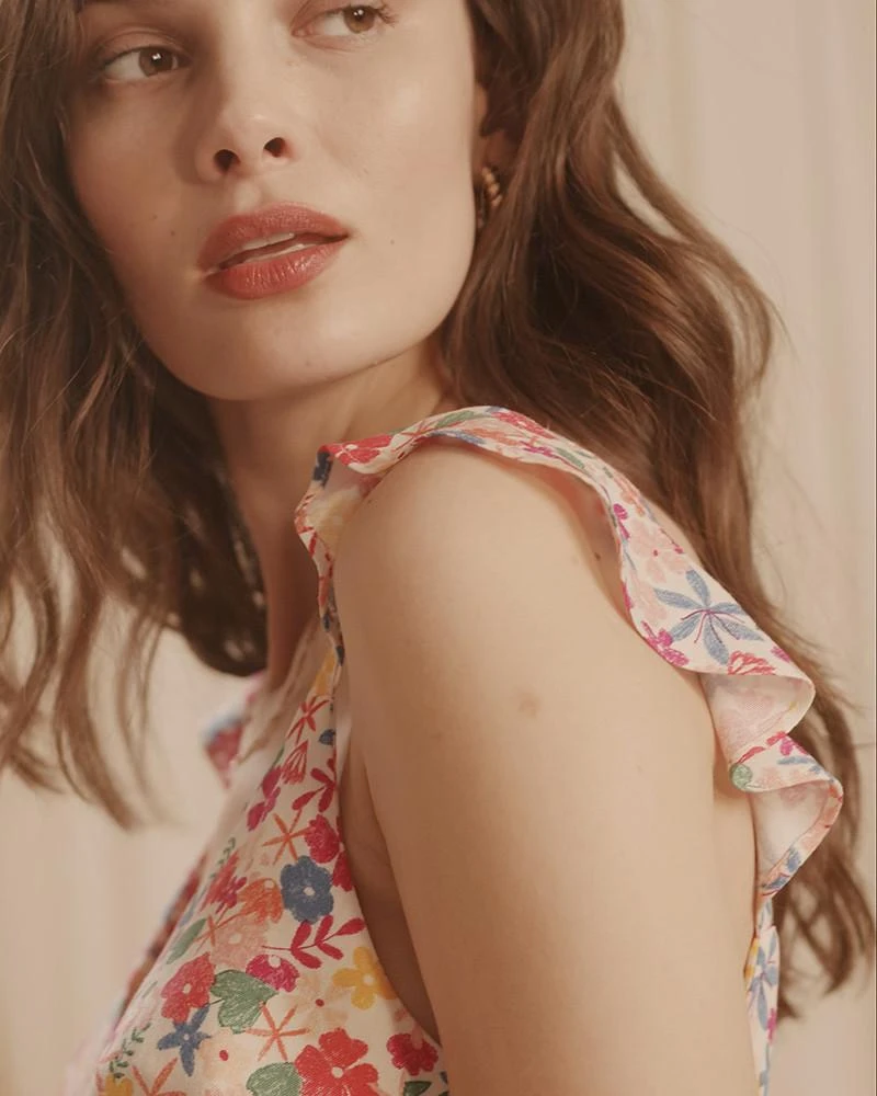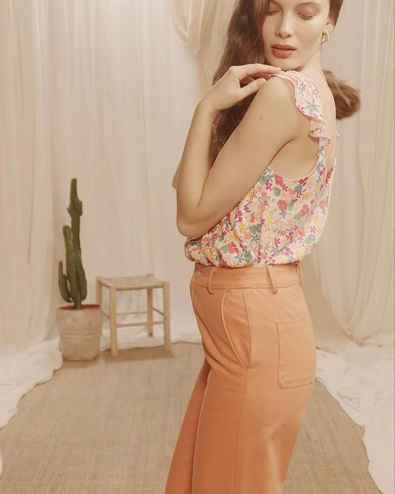 La coupe : COLAS est un top sans manches en imprimé exclusif G&M, dessiné à la main avec un effet crayons de couleurs. Des mancherons à volants se posent sur les épaules et révèlent un décolleté en V sur le devant et sur le dos ouvert/fermé par une ligne de boutons.
