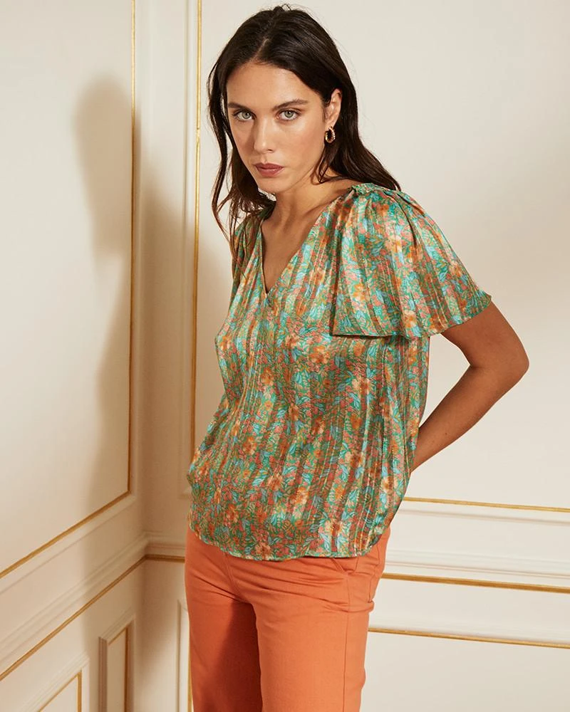 La coupe : COME est un top en mousseline imprimée avec des finitions lurex, un décolleté en V et des manches tulipes.