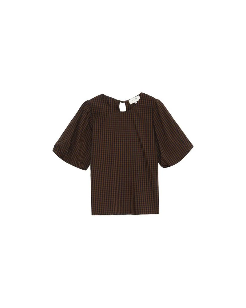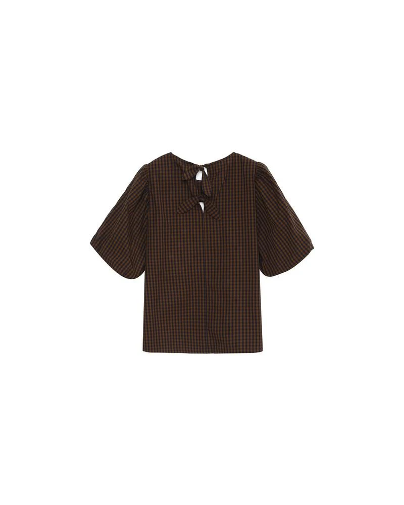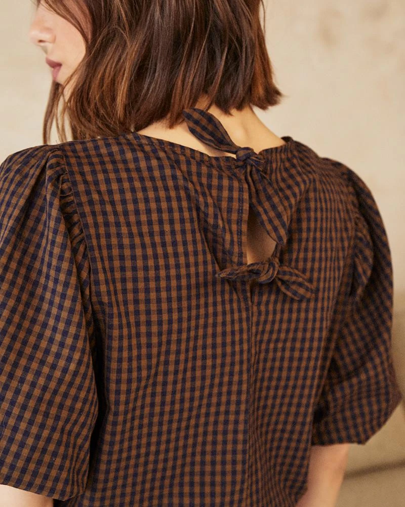 La coupe : DAN est un top à carreaux à manches courtes bouffantes avec une encolure ronde et une ouverture au dos avec deux noeuds à nouer.