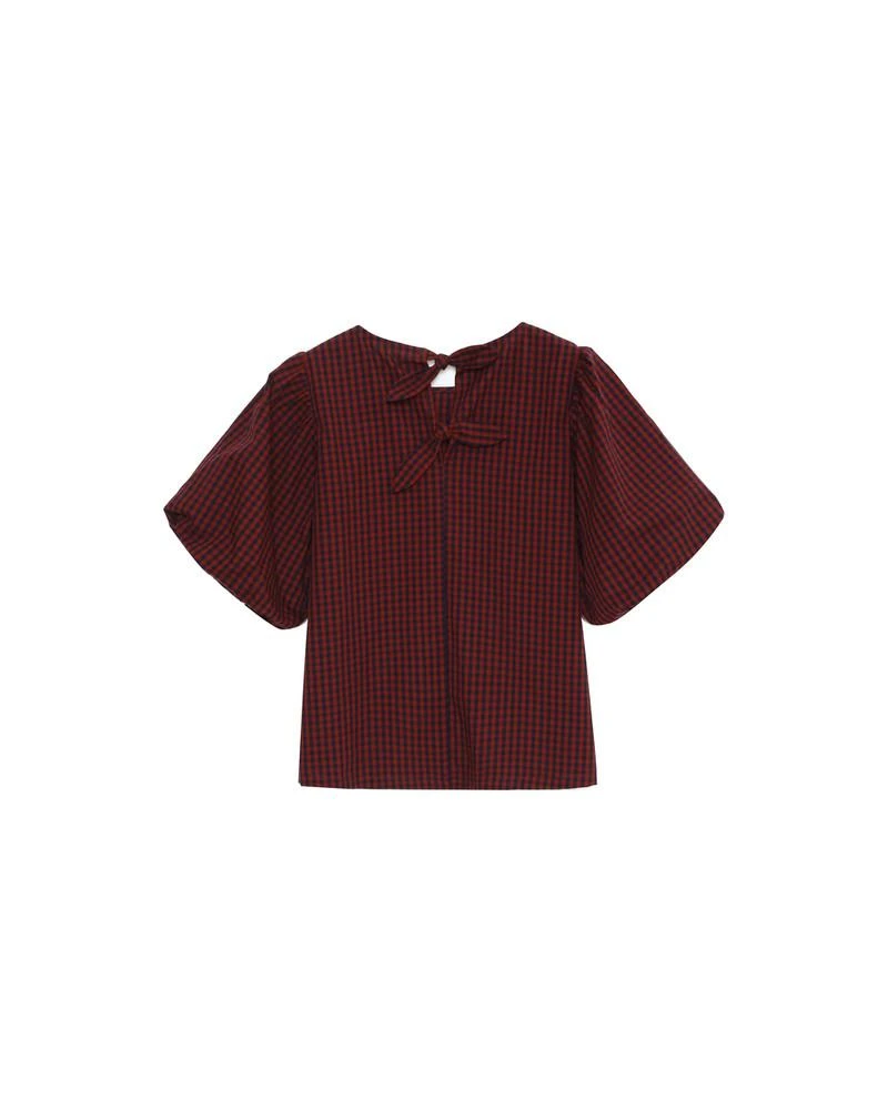 La coupe : DAN est un top à carreaux à manches courtes bouffantes avec une encolure ronde et une ouverture au dos avec deux noeuds à nouer.