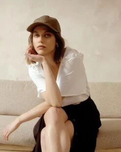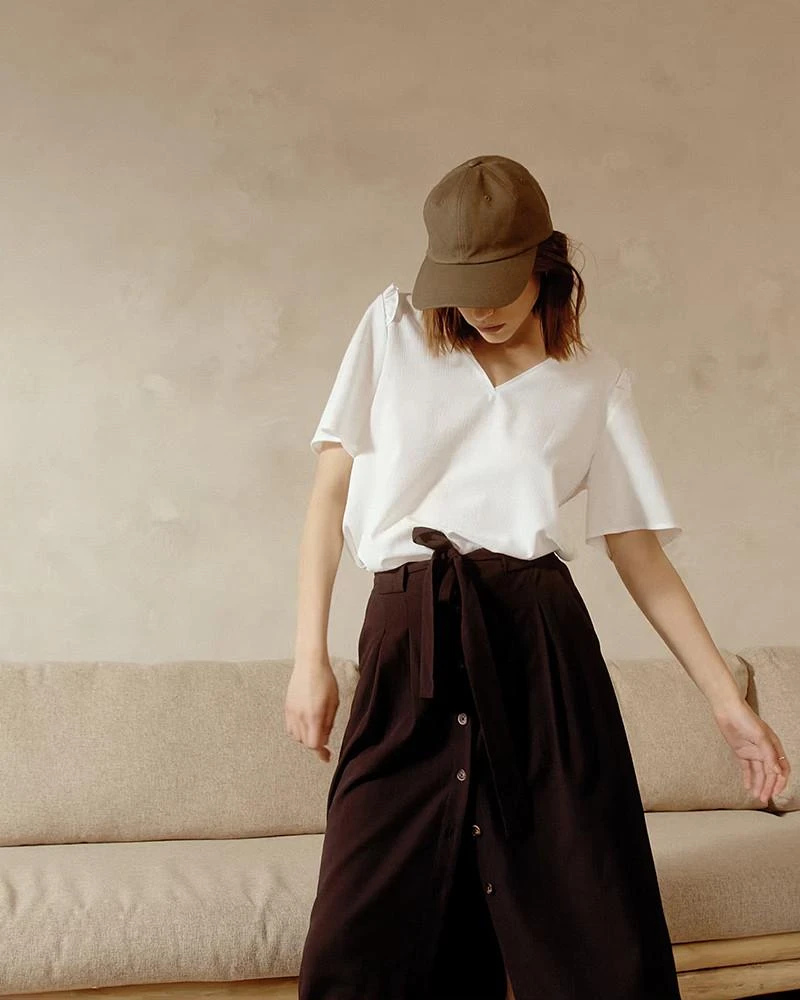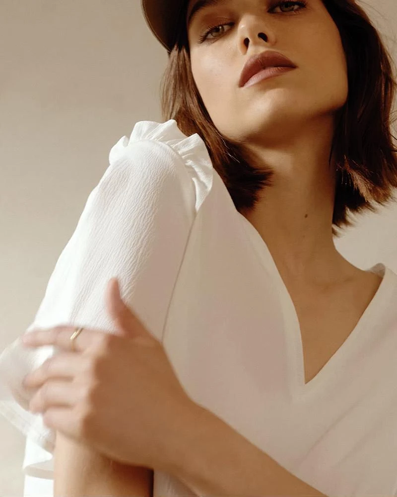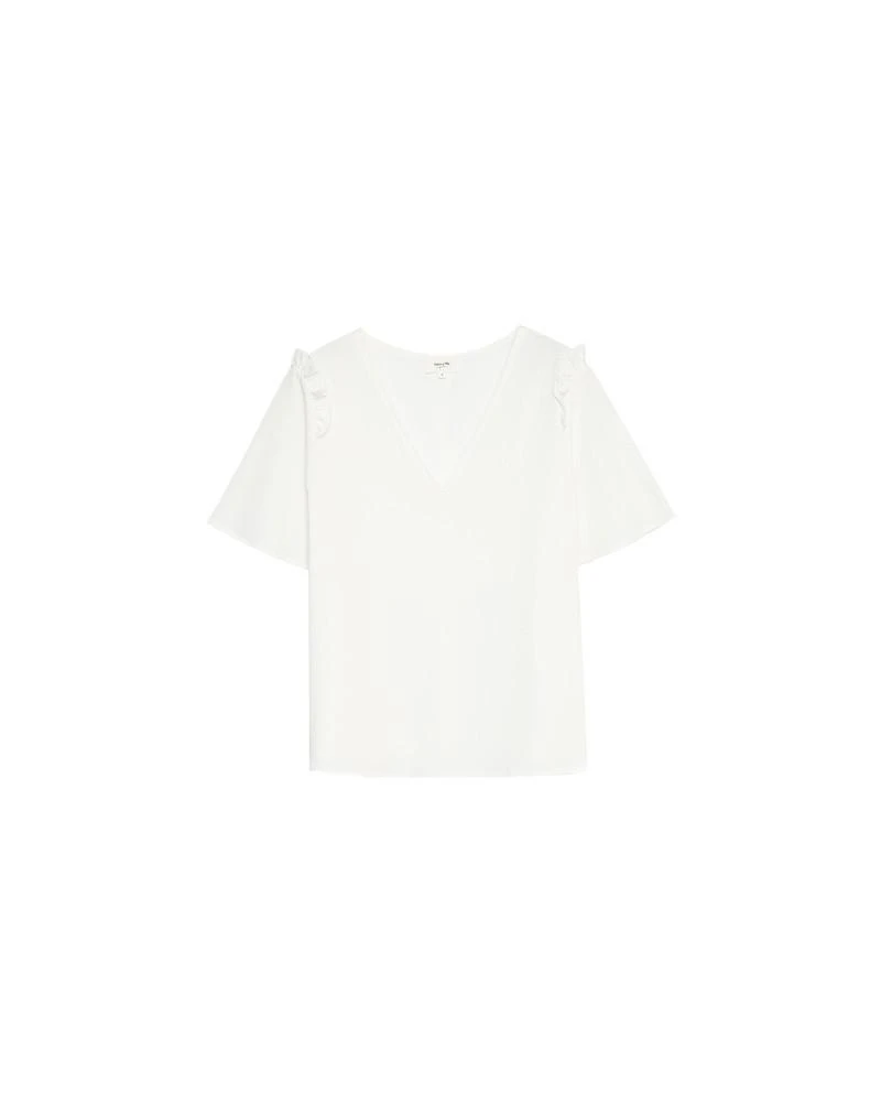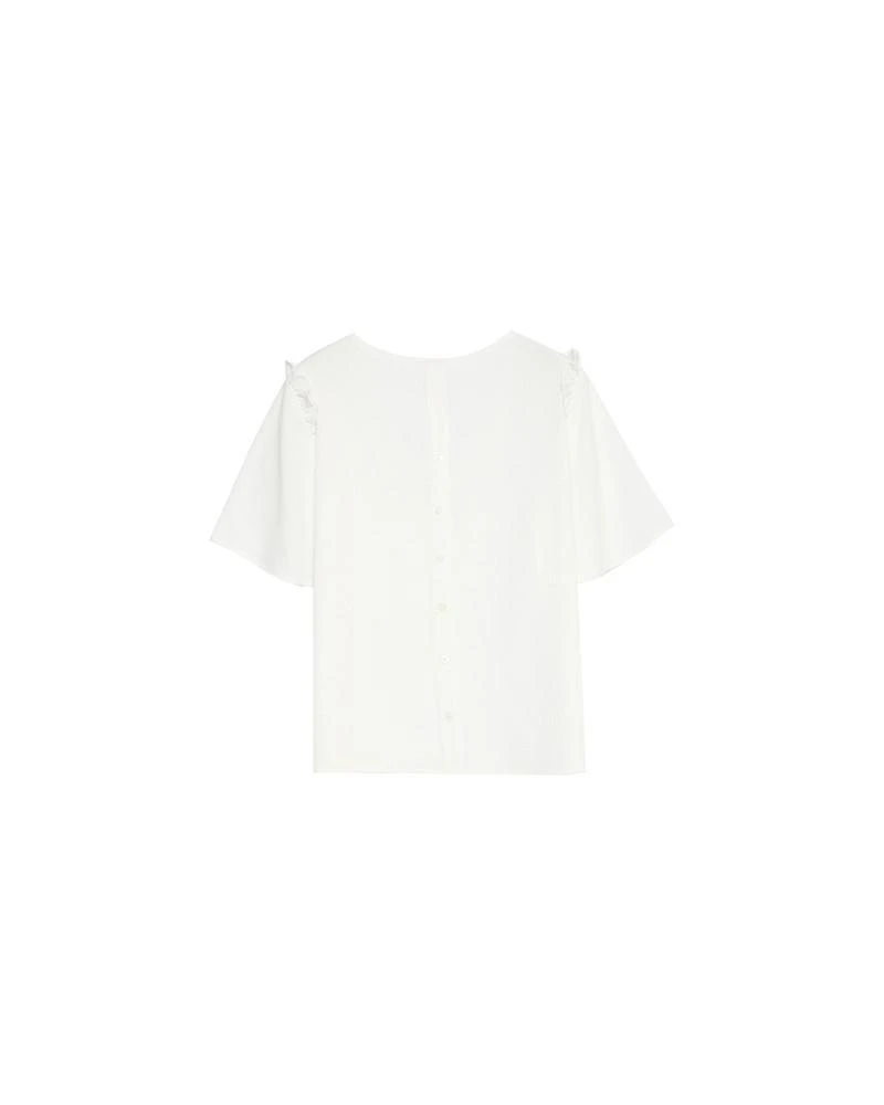 La coupe : DANDY est un top à manches courtes évasées avec un col en V, des mini volants intérieurs sur les épaules et une patte de boutonnage au dos.