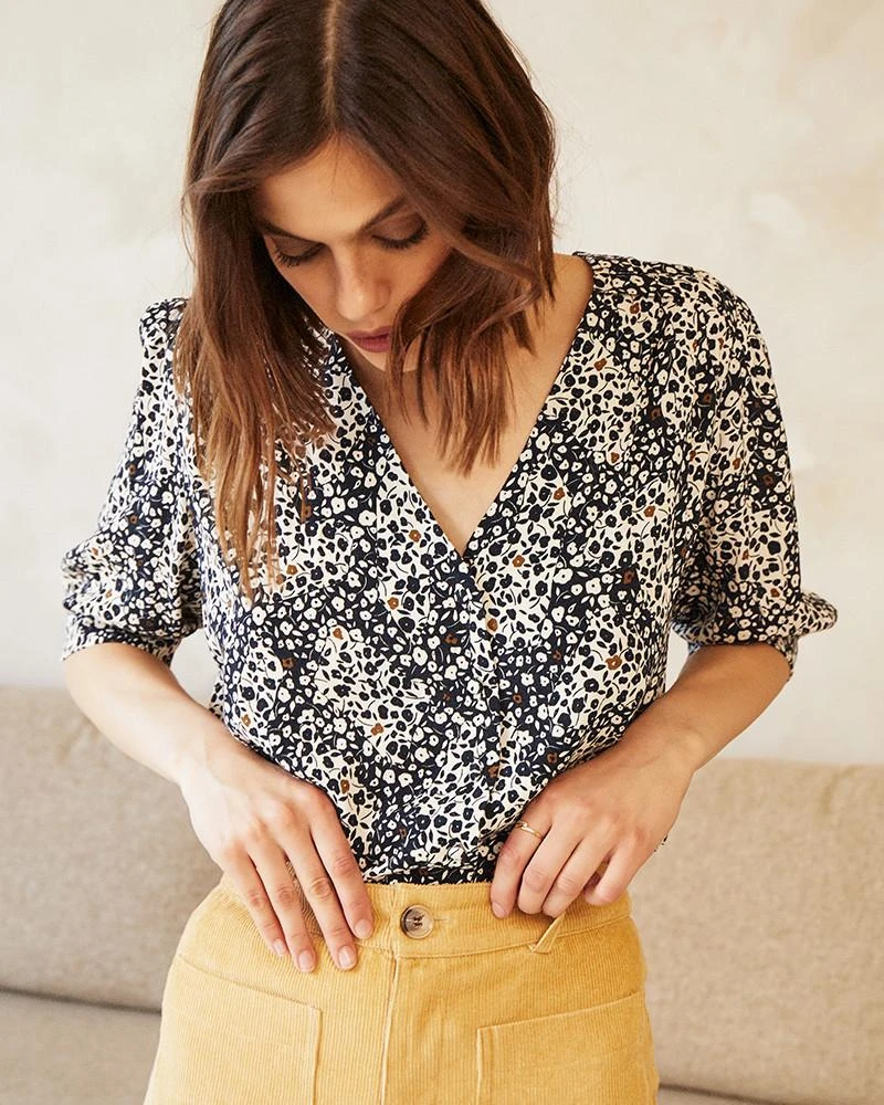 La silhouette : Cette blouse légère et romantique est très agréable sur la peau. Avec un tissu rayonne-viscose, elle rejoint notre gamme en fibres naturelles Un brin de vert. Sa coupe est légèrement crop et idéale pour les amatrices de vintage. Son imprimé fleuri all-over a été dessiné exclusivement par nos équipes.