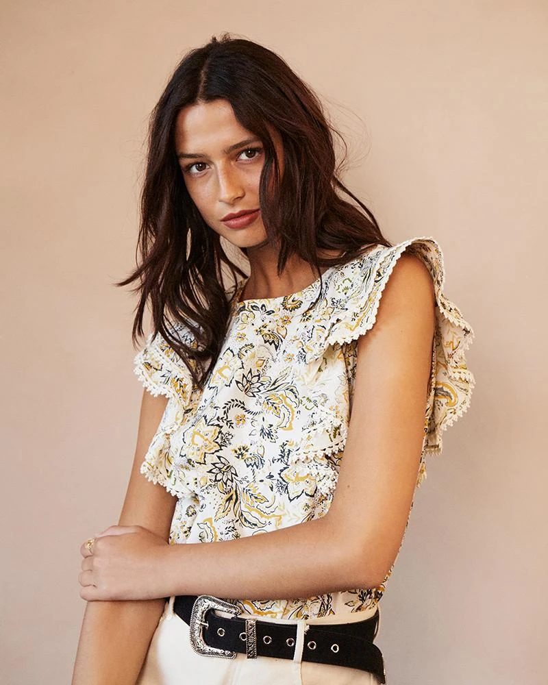 La silhouette : Ce top féminin est un petit bijoux ! Pièce emblématique de la collection, DIARY est un top plein de détails délicats qui font la différence. Son imprimé paisley a été dessiné exclusivement par nos équipes. Avec un tissu en 100% coton, il rejoint notre gamme en fibres naturelles Un brin de vert. On craque complètement pour la découpe des volants sur les épaules qui structurent la silhouette et font de ce top une pièce mode et romantique à souhait.