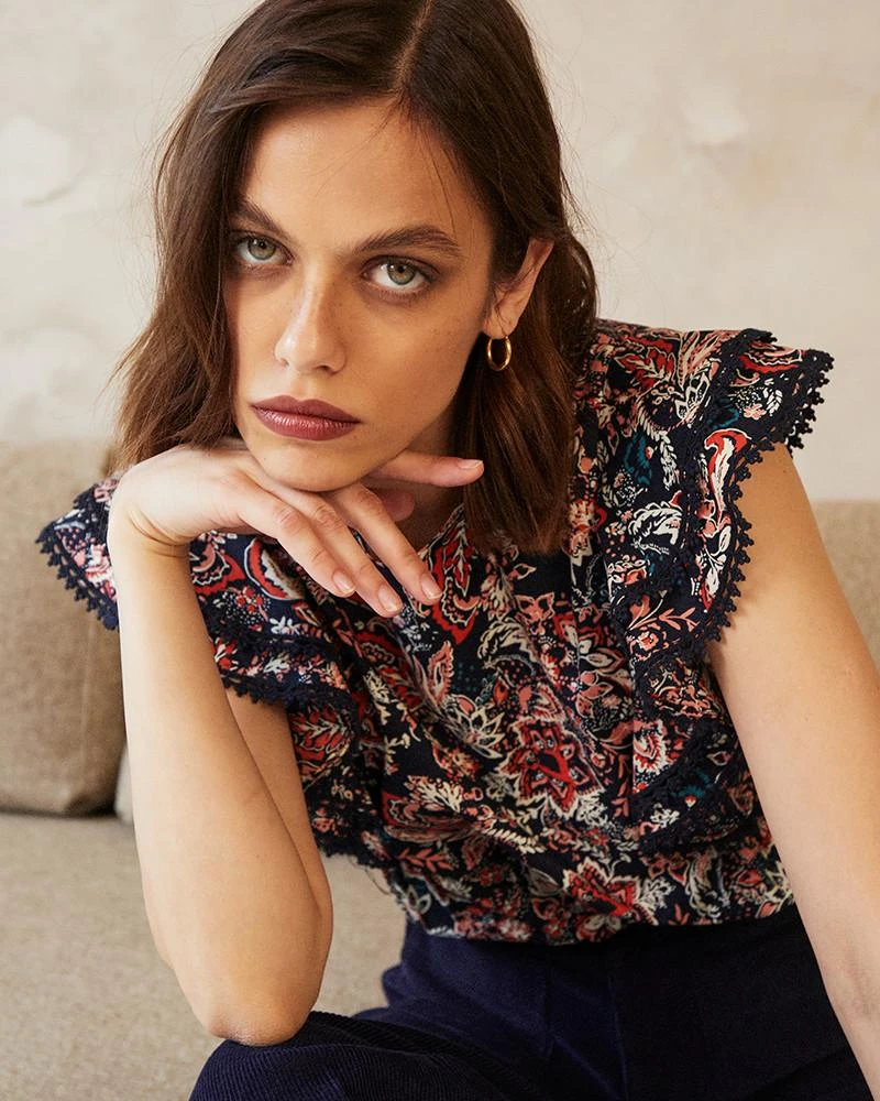 La silhouette : Ce top féminin est un petit bijoux ! Pièce emblématique de la collection, DIARY est un top plein de détails délicats qui font la différence. Son imprimé paisley a été dessiné exclusivement par nos équipes. Avec un tissu en 100% coton, il rejoint notre gamme en fibres naturelles Un brin de vert. On craque complètement pour la découpe des volants sur les épaules qui structurent la silhouette et font de ce top une pièce mode et romantique à souhait.