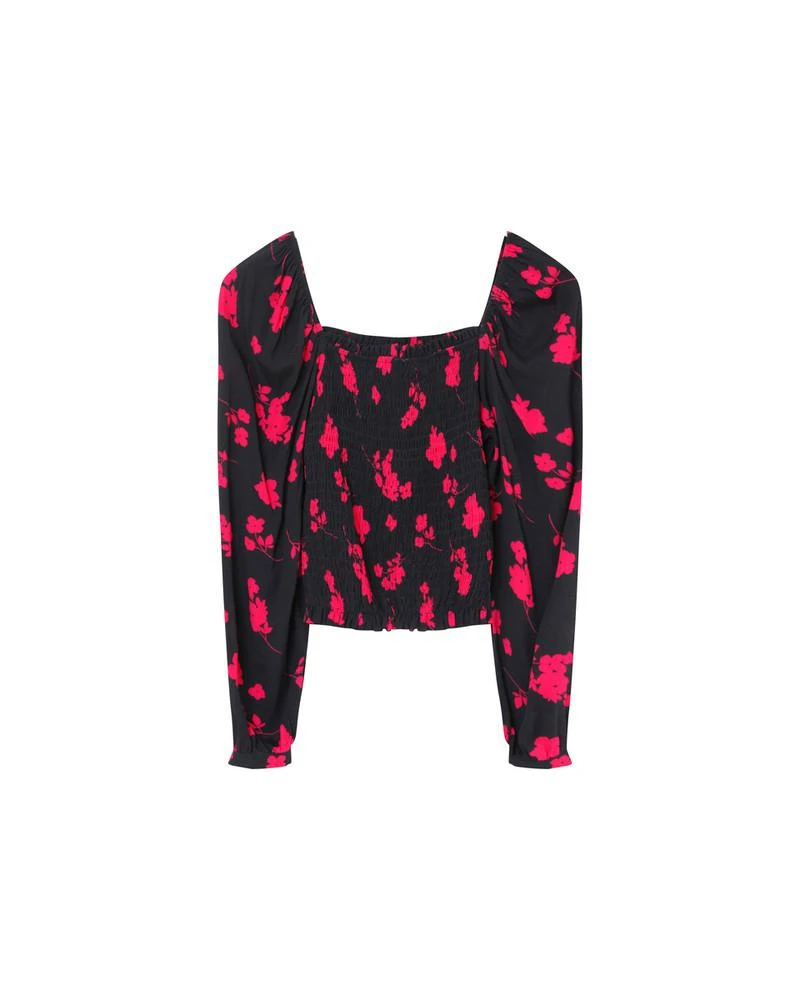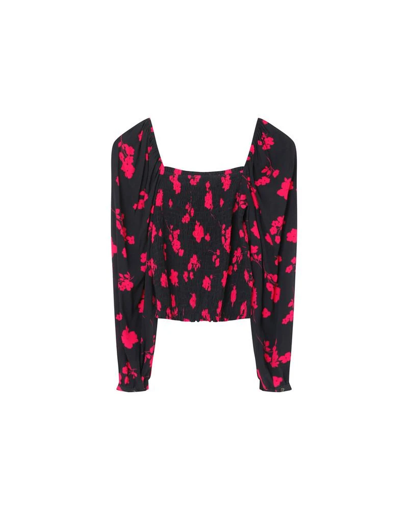 « La coupe : DOREMI est un top court en imprimé exclusif G&M. Ses manches longues légèrement ballons sont froncées sur les épaules et s’achèvent par un jeu de volants timides sur les poignets.