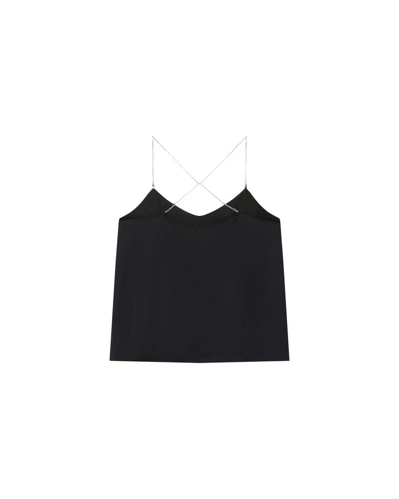 La coupe : DRISS est un débardeur satiné doublé avec des bretelles en chaînettes métalliques amovibles.