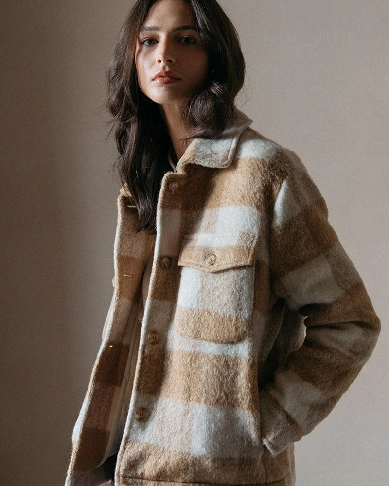 La coupe : DARIA est une veste à carreaux oversize avec des poches doubles plaquées et une patte de boutonnage sur le devant.