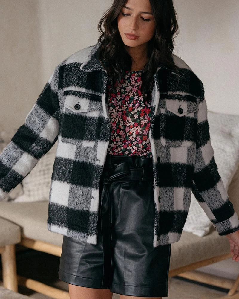 La coupe : DARIA est une veste à carreaux oversize avec des poches doubles plaquées et une patte de boutonnage sur le devant.