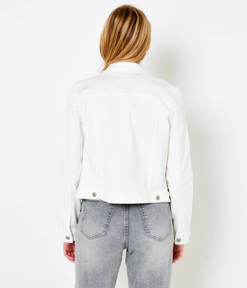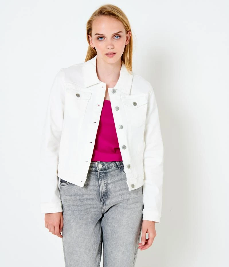 Vente Veste en jean blanc femme waterless process Camaieu – Une veste femme confectionnée en denim blanc de coton-élasthanne pour plus de confort et délavé selon un processus innovant waterless process réduisant la consommation d’eau. Coupe droite, col chemise, fermeture boutons métal, poches rabats poitrine, poches latérales. Le mannequin mesure 1.75M et porte une taille M.