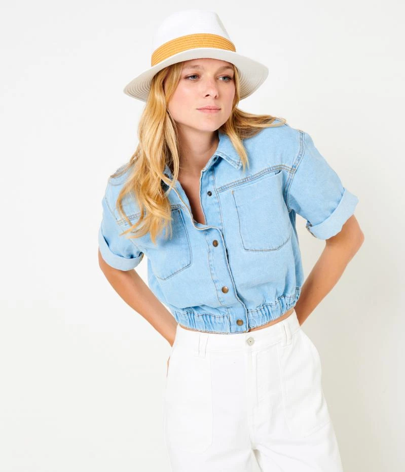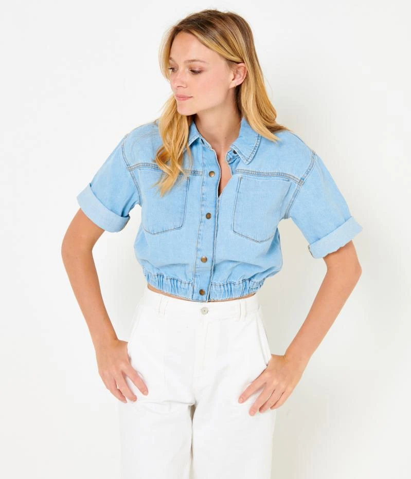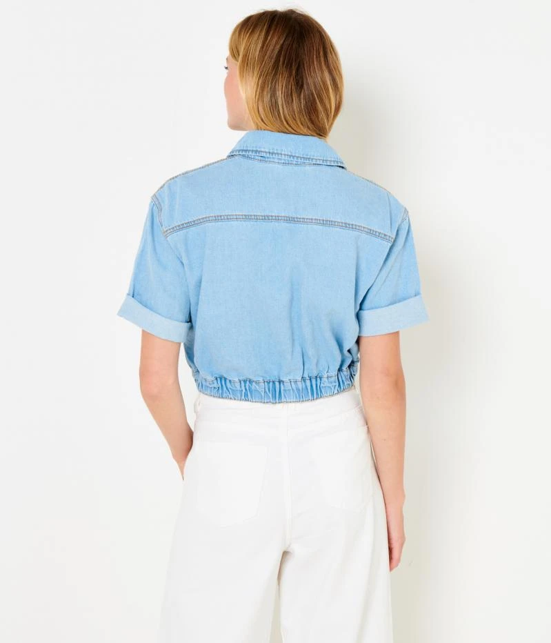 Vente Veste en jean femme manches courtes Camaieu – Une veste femme confectionnée en denim de coton. Coupe écourtée, col chemise, fermeture pressions métal, manches courtes à revers, élastique à la base, poches plaquées poitrine. Le mannequin mesure 1.75M et porte une taille M.